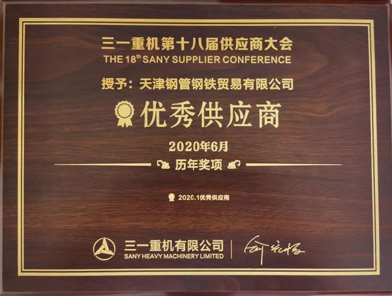 天津大無縫鋼管廠憑借過硬的產品質量和優質的技術服務,公司高端工程機械用管新品開發和市場推廣工作碩果累累,產品質量和生產保供任務均得到用戶的高度贊譽。連續三年榮獲三一重機有限公司“優秀供應商”稱號;在北京三一智造科技有限公司旋挖機鉆柱用管和浙江三一裝備有限公司起重機臂架管招標中,天津大無縫鋼管廠斬獲旋挖機鉆柱用管訂單超7成,TP890C鋼級履帶起重機臂架管成功打入市場,產品性能與質量得到用戶的充分肯定。